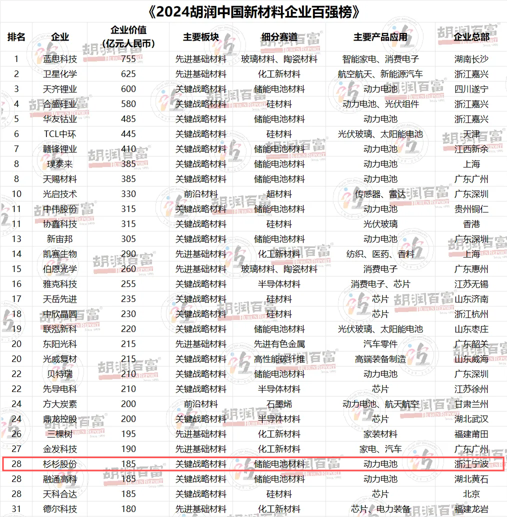 7月26日,胡润研究院发布《2024胡润中国新材料企业百强榜》及《2024胡润中国新能源潜力企业百强榜》。杉杉股份以第28位登上《2024胡润中国新材料企业百强榜》,杉杉锂电以第9位登上《2024胡润中国新能源潜力企业百强榜》。
